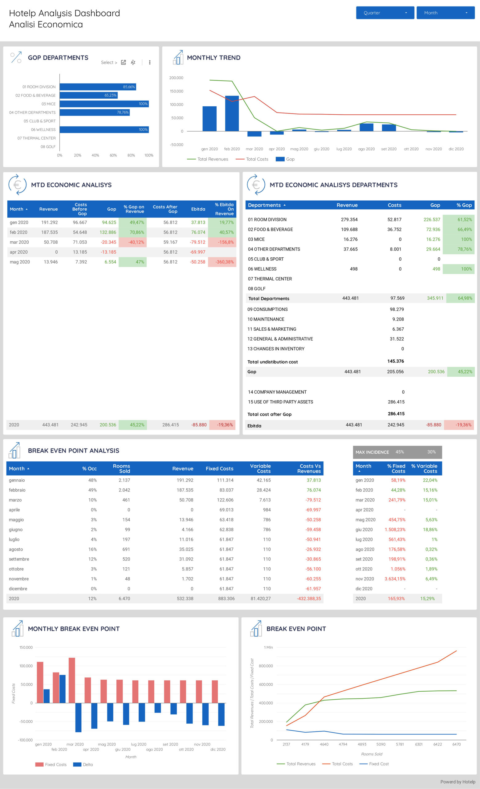 Confronto Costi e Ricavi per reparto, analisi dell'andamento dei costi fissi e variabili con incidenza rispetto ai ricavi, visualizzazione dinamica del Break Even Point su base mensile e in rapporto alle camere vendute.